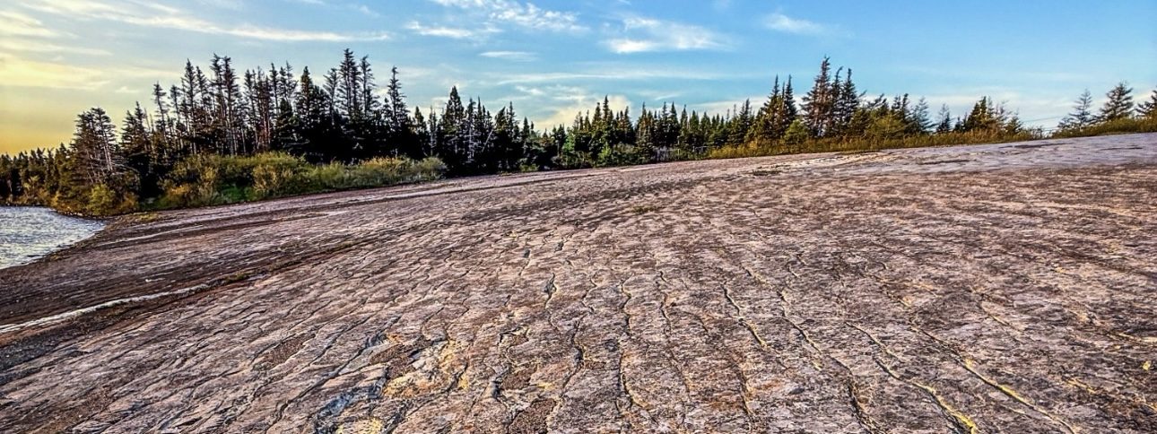 As the ice sheets moved slowly over the land, they scraped off topsoil and dumped it offshore on the Grand Banks, making habitats suitable for seafloor creatures that are food for many commercial species, making it one of richest fishing grounds in the North Atlantic. Evidence of that glacial scour beneath the ice sheet can be seen here at Lookout Park because stones at the bottom of the ice sheet that were pressed onto bedrock gouged scratches into the surface.