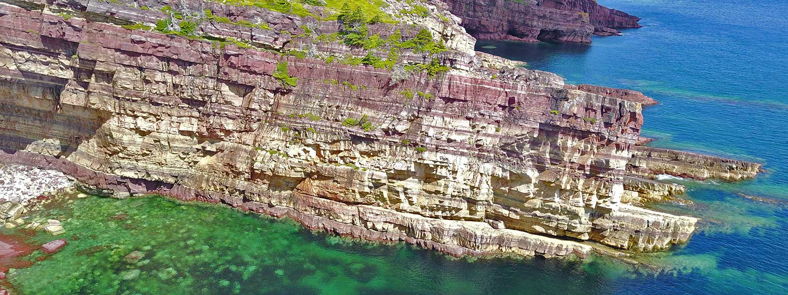 The spectacular multi-coloured rock layers exposed here at Brook Point are from the Crown Hill Formation. These rocks are Ediacaran in age but do not contain the Ediacaran fossils you can observe on the other side of the peninsula. These coastal cliffs are a classic example of sedimentary rock. Sedimentary rocks are one of three main rock types and can form from particles of sediment of all different types. Layers of sediment build and build, eventually getting buried under the newer layers. Over time, these multiple layers are squished and cemented together to form rock. In this case, a range of sand, silt, and mud was eroded by rivers from an ancient volcanic mountain range. The brilliant red colour of the rocks is due to the rusting or oxidation of fine, iron-rich grains when exposed to the ancient atmosphere or oxidized sea. Other colour variations are due to volcanic ash and chemical changes from ancient fluids percolating through the sediment.
